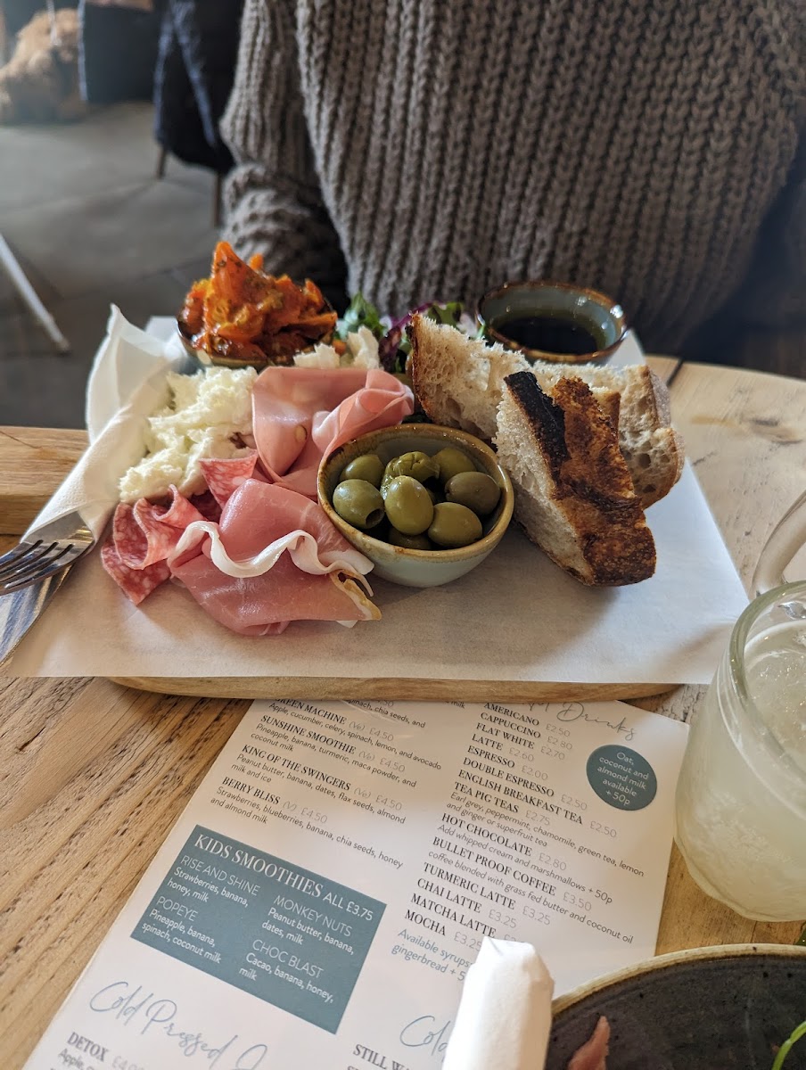 Prosciutto ham, mozzarella, rocket and parmesan, cherry tomatoes, olives, artisan bread with olive oil and vinegar dip.